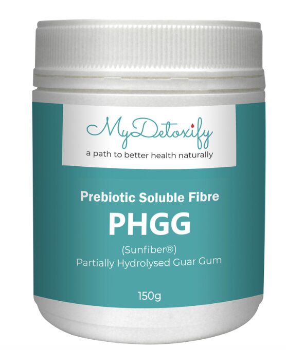 The PHGG is naturally enzymatically hydrolysed to break the viscosity of the Guar Gum into smaller soluble units that dissolve more easily in water. PHGG is a colourless and odourless dietary fibre which contributes to regular laxation (bowel movements) and a valuable prebiotic to support microflora balance, digestive health, intestinal comfort. When consumed in water at meal times it may assist the body to reduce post meal blood sugar spikes by decreasing the glycemic index of foods.